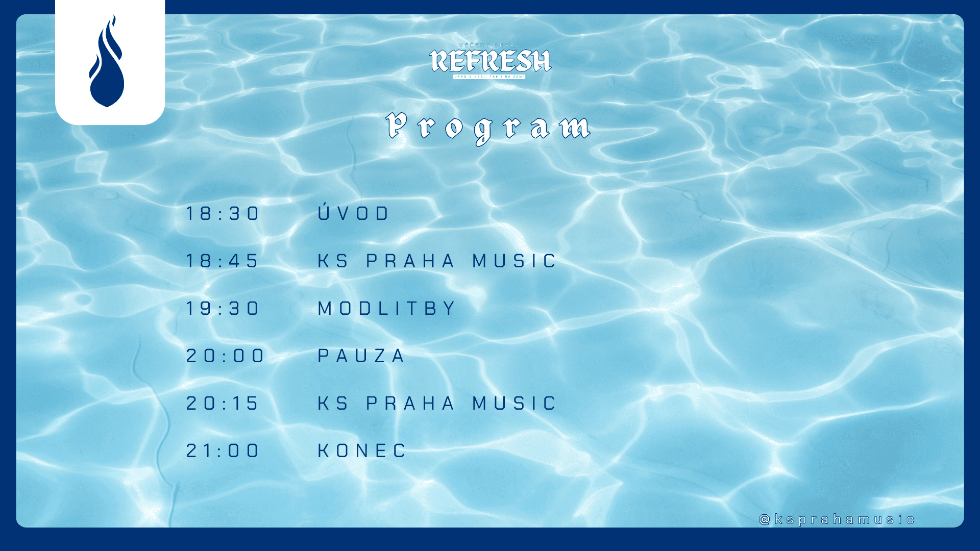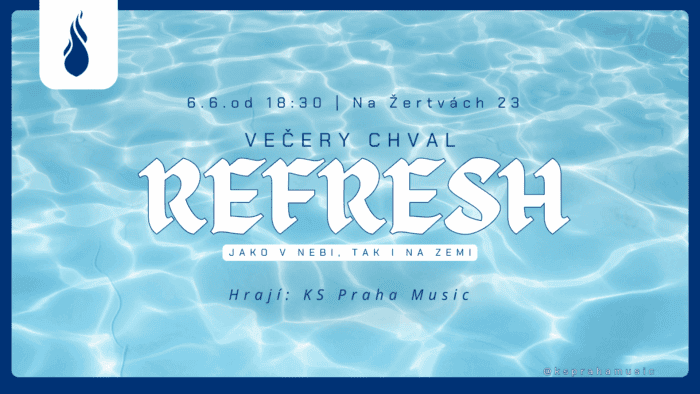 Večer plný modliteb, chval a Boží přítomnosti. To je REFRESH. Akce se opakuje každý měsíc a tradičně je tvořená 2 hodinovými bloky chval, mezi nimiž je promluva řečníka.