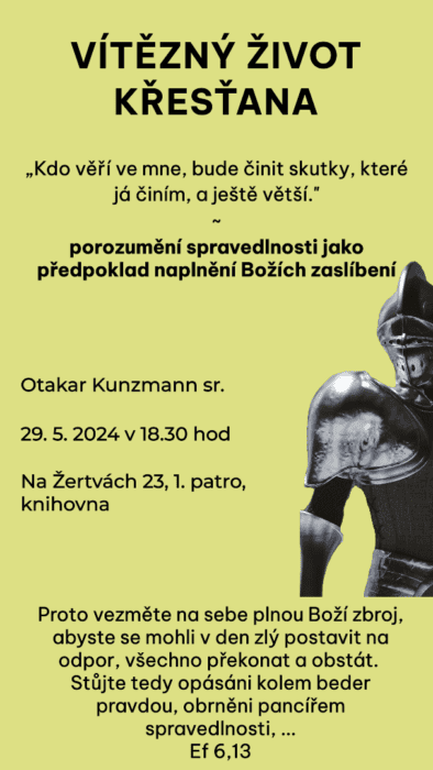 Jsem přesvědčen, že jedním z předpokladů, abychom dokázali toto zaslíbení alespoň částečně naplnit, je i naše správné porozumění slovu spravedlnost. Pokud si budeme jisti, že jsme opásáni pancířem spravedlnosti, budeme schopni se v den zlý nejen postavit na odpor, ale dokážeme překonat i další životní výzvy, a nakonec budeme možná činit takové skutky, které činil Ježíš. Během setkání, na které vás tímto zvu, si povíme, co si pod pojmem spravedlnost představit, jaká zaslíbení se v Bibli ke spravedlnosti váží a jak do spravedlnosti vstoupit prakticky.